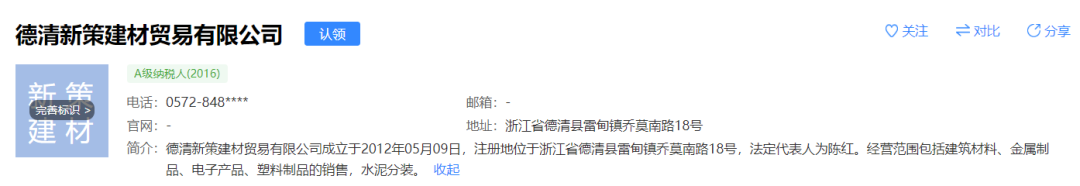 經(jīng)查,德清新策建材貿(mào)易有限公司注冊地址位于浙江省德清縣雷甸鎮(zhèn)喬莫南路18號,經(jīng)營范圍為建筑材料、金屬制品、電子產(chǎn)品、塑料制品的銷售,水泥分裝等。
