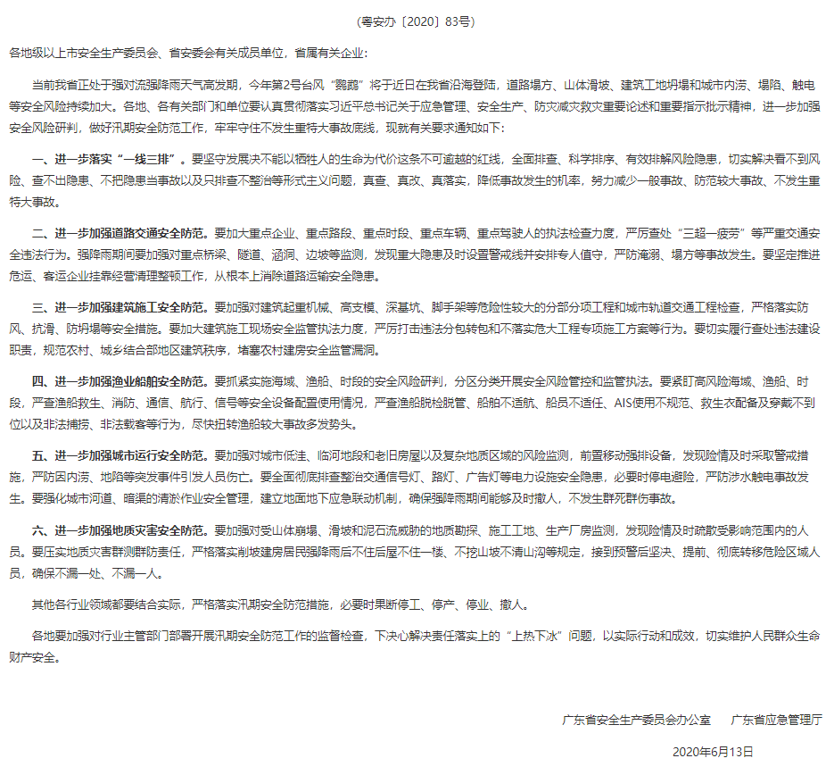 6月13日,廣東省安委辦、省應(yīng)急管理廳就進(jìn)一步加強(qiáng)汛期安全防范工作發(fā)出通知,要求各地、各有關(guān)部門和單位要進(jìn)一步加強(qiáng)安全風(fēng)險(xiǎn)研判,做好汛期安全防范工作,各地要加強(qiáng)對行業(yè)主管部門部署開展汛期安全防范工作的監(jiān)督檢查,牢牢守住不發(fā)生重特大事故底線。