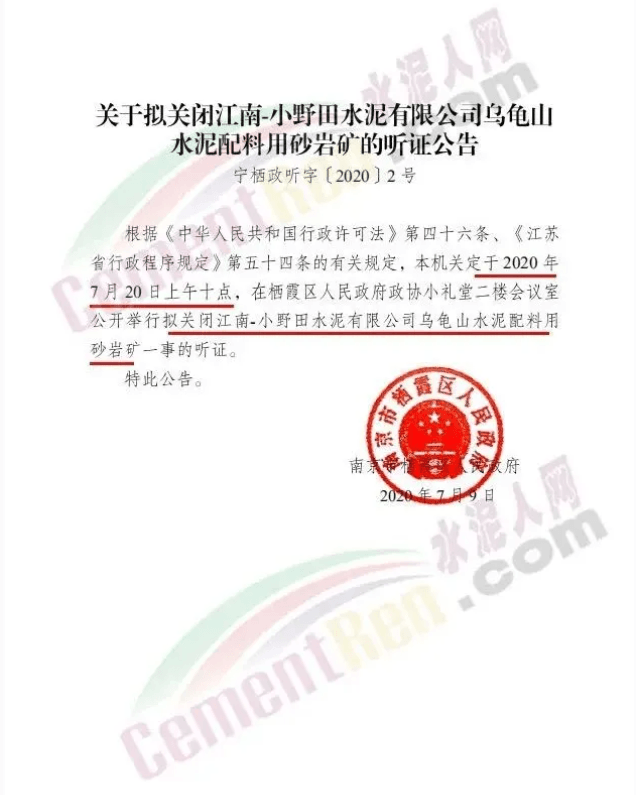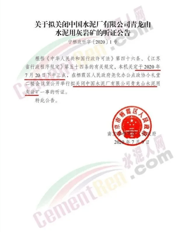 在蘇北淮海中聯(lián)水泥退出一事懸而未決之時,南京市棲霞區(qū)政府的這兩則聽證會公告,更加重了當(dāng)?shù)?a href="http://www.ifaga.cn/news/list_1.html" target="_blank" class="keylink">水泥行業(yè)的緊張情緒。據(jù)水泥人網(wǎng)了解,2019年7月8日和10月15日淮海中聯(lián)水泥所屬焦山礦區(qū)和青龍山礦區(qū)開采許可證分別到期,骨料、熟料及粉磨生產(chǎn)線相繼停產(chǎn)。當(dāng)?shù)卣丛倮m(xù)批礦山許可。淮海中聯(lián)水泥一直外購礦石用于生產(chǎn)。