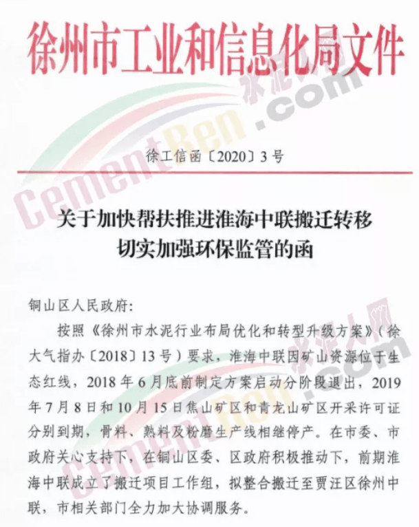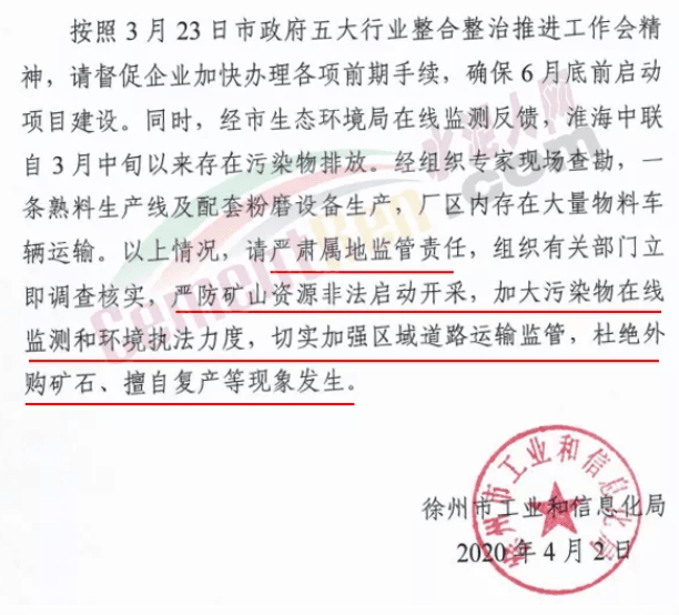 今年3月份,徐州市工信局為了進(jìn)一步敦促淮海中聯(lián)水泥盡快退出,發(fā)布了《關(guān)于加快幫扶推薦淮海中聯(lián)搬遷轉(zhuǎn)移切實(shí)加強(qiáng)環(huán)保監(jiān)管的函》稱,要求相關(guān)部門嚴(yán)肅屬地監(jiān)管責(zé)任,組織有關(guān)部門立即調(diào)查,嚴(yán)防礦山資源非法啟動開采,加大污染物在線監(jiān)測和環(huán)境執(zhí)法力度,切實(shí)加強(qiáng)區(qū)域道路運(yùn)輸監(jiān)管,杜絕外購礦石、擅自復(fù)產(chǎn)等現(xiàn)象。