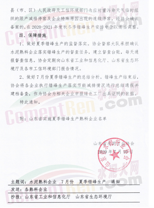 據(jù)水泥人網(wǎng)消息,近日,山東省水泥行業(yè)協(xié)會(huì)發(fā)布《關(guān)于山東省水泥熟料企業(yè)7月份開(kāi)展夏季錯(cuò)峰生產(chǎn)的通知》稱(chēng):為堅(jiān)決貫徹落實(shí)山東省政府《山東省打瀛藍(lán)天保衛(wèi)戰(zhàn)作戰(zhàn)計(jì)劃暨2013-2020年大氣污染防治規(guī)劃三期行動(dòng)計(jì)劃(201-2020年)》精神,促進(jìn)全省大氣環(huán)境質(zhì)量持續(xù)改善,確保水泥行業(yè)平穩(wěn)有序運(yùn)行,山東省水泥協(xié)會(huì)決定2020年7月份實(shí)施夏季錯(cuò)峰生產(chǎn),具體通知如下: