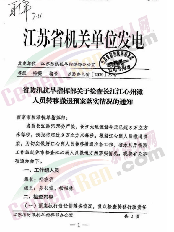 江蘇省防汛抗旱指揮部辦公室發(fā)布關(guān)于檢查長(zhǎng)江江心州灘人員轉(zhuǎn)移撤退預(yù)案落實(shí)情況的通知稱,根據(jù)江心洲人員撤退預(yù)案,為切實(shí)做好江心洲人員轉(zhuǎn)移撤退準(zhǔn)備工作,省水利廳將派工作組進(jìn)駐檢查江心洲人員撤退方案落實(shí)情況。