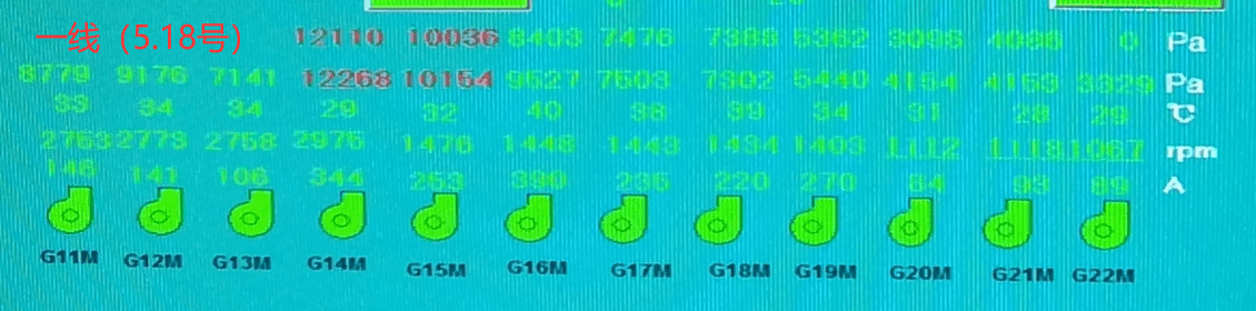 對(duì)比當(dāng)天兩條線12臺(tái)篦冷風(fēng)機(jī)運(yùn)行電流可見,在一線熟料產(chǎn)量高于二線的前提下,一線僅有G14風(fēng)機(jī)實(shí)際運(yùn)行電流明顯高于二線(設(shè)計(jì)全壓比二線高1000Pa),G18、G21兩臺(tái)風(fēng)機(jī)電流稍高,但在波動(dòng)范圍內(nèi),其余9臺(tái)風(fēng)機(jī)運(yùn)行電流均比二線對(duì)應(yīng)風(fēng)機(jī)電流低。中控顯示12臺(tái)風(fēng)機(jī)運(yùn)行電流一線篦冷風(fēng)機(jī)較二線篦冷風(fēng)機(jī)低230A以上。