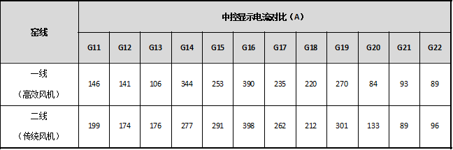 該公司二線篦冷機(jī)改造配套風(fēng)機(jī)為國(guó)內(nèi)某傳統(tǒng)廠家篦冷風(fēng)機(jī),項(xiàng)目于2019年竣工。2020年5月18日,一線熟料日產(chǎn)量6400t左右,二線熟料日產(chǎn)量6300t左右,對(duì)比兩條線篦冷風(fēng)機(jī)中控顯示運(yùn)行電流如下: