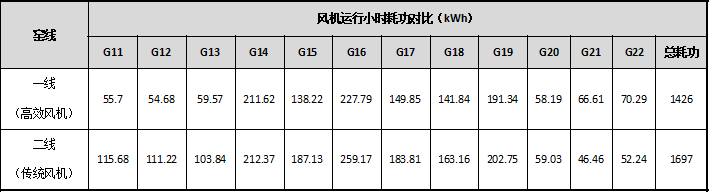 工程技術(shù)人員在窯線正常運(yùn)行工況下分別對(duì)兩條線篦冷風(fēng)機(jī)實(shí)際運(yùn)行耗功進(jìn)行了測(cè)算,結(jié)果見下表:
