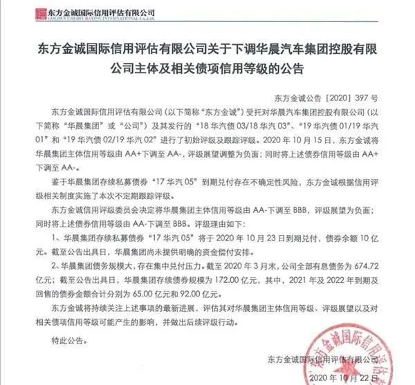 大公表示,按照2017年9月華晨集團與債權(quán)投資計劃受托人太平資產(chǎn)管理有限公司簽署的《太平一一華晨汽車制造產(chǎn)業(yè)升級債權(quán)投資計劃投資合同》約定,華晨集團應(yīng)于2020年9月21日劃撥季度應(yīng)付利息。截至2020年10月14日,華晨集團仍未將應(yīng)付季度利息劃撥至債權(quán)投資計劃托管人賬戶。而東方金誠很罕見的在債券違約當(dāng)天就掛出了評級下調(diào)公告,華晨集團的主體信用評級再一次斷崖式下跌至BBB。