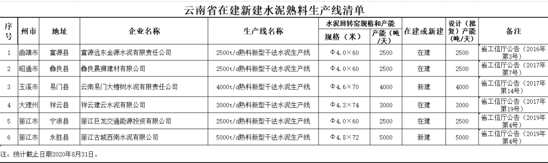 9月末云南省工信廳發(fā)布了云南省水泥熟料生產(chǎn)線清單公告,其中明確截止到2020年8月31日共有四條新型干法水泥熟料生產(chǎn)線在建,其中兩條為新建項(xiàng)目,設(shè)計(jì)產(chǎn)能合計(jì)585萬(wàn)噸/年。