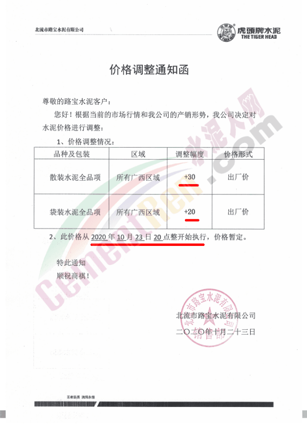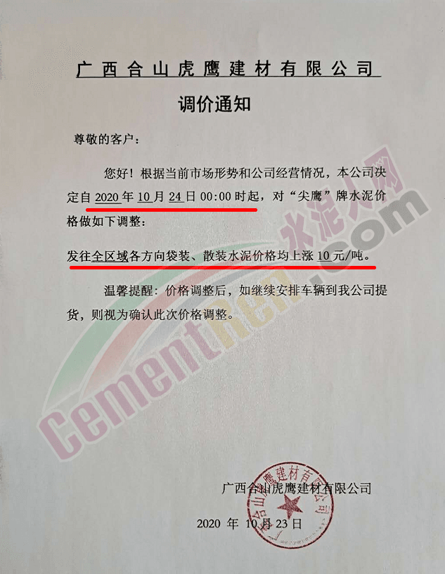 臺泥(貴港)水泥有限公司通知于2020年10月24日00:00起,對(玉林市,梧州市,貴港市,北海市、靈山縣、浦北縣、橫縣)的全品項袋裝水泥上調20元/噸、全品項散裝水泥上調30元/噸;于2020年10月26日00:00起,對(來賓市,柳州市,河池市)的全品項袋裝、散裝水泥上調20元/噸。