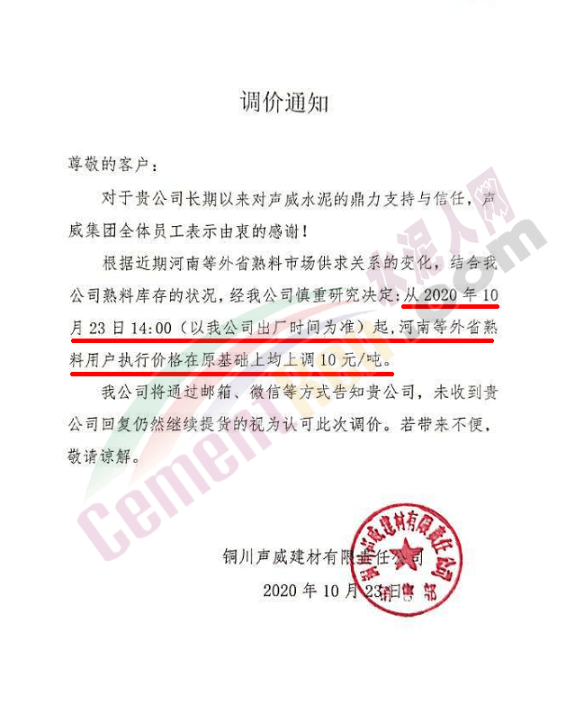水泥人網(wǎng)通訊員消息,因重污染天氣臨停影響,河南多區(qū)域水泥企業(yè)通知價格上調(diào),10月22日~23日鄭州、新鄉(xiāng)、許昌、駐馬店、安陽、禹州、登封等地陸續(xù)通知上調(diào)高標(biāo)水泥價格30元/噸。目前區(qū)域內(nèi)多數(shù)熟料線停窯檢修,管控加強后,水泥生產(chǎn)受限,庫存下滑,周邊區(qū)域有意陸續(xù)跟進上調(diào)。新鄉(xiāng)區(qū)域水泥經(jīng)銷企業(yè)新鄉(xiāng)凱文建材有限公司通知因冬季管控,水泥在原合同基礎(chǔ)上每噸上調(diào)100元。