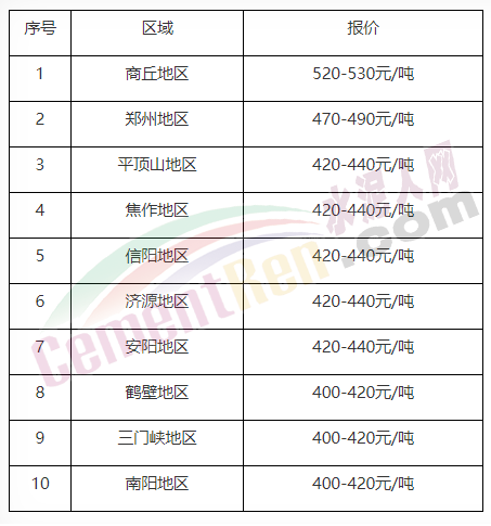 河南部分區(qū)域PO42.5散裝水泥出廠報價如下:
