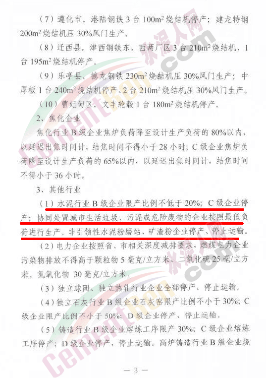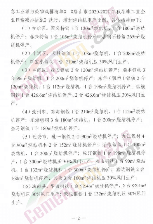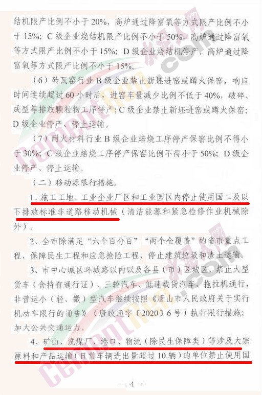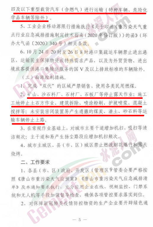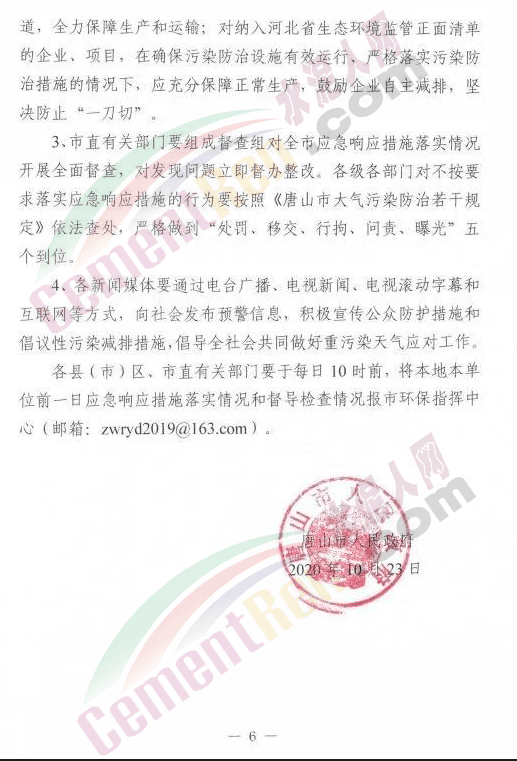 日前,唐山市人民政府發(fā)布特提等級文件《關(guān)于啟動重污染天氣II級應(yīng)急響應(yīng)的通知》稱,自2020年10月23日18時全市啟動重污染天氣II級應(yīng)急響應(yīng),解除時間另行通知。工業(yè)源停限產(chǎn)措施,要求在嚴(yán)格落實《唐山市2020-2021年秋冬季工業(yè)企業(yè)日常減排措施》的基礎(chǔ)上,按照《重污染天氣應(yīng)急工業(yè)源污染物減排清單》中“橙色預(yù)警減排措施”執(zhí)行。水泥行業(yè)B級企業(yè)限產(chǎn)比例不低于20%;C級企業(yè)停產(chǎn);協(xié)同處置城市生活垃圾、污泥或危險廢物的企業(yè)按照最低負(fù)荷進行生產(chǎn)。非引領(lǐng)性水泥粉磨站、礦渣粉企業(yè)停產(chǎn)、停止運輸。施工工地、工業(yè)企業(yè)廠區(qū)和工業(yè)園區(qū)內(nèi)停止使用國二及以下排放標(biāo)準(zhǔn)非道路移動機械(清潔能源和緊急檢修作業(yè)機械除外)。 全市除滿足“六個百分百”“兩個全覆蓋”的省市重點工程、保障民生工程和應(yīng)急搶險工程,停止建筑垃圾和渣土運輸。礦山、洗煤廠、港口、物流(除民生保障類)等涉及大宗原料和產(chǎn)品運輸(日常車輛進出量超過10輛)的單位禁止使用國四及以下重型載貨汽車(含燃?xì)?進行運輸(特種車輛、危險化學(xué)品車輛等除外)。工業(yè)企業(yè)移動源限行措施執(zhí)行《關(guān)于印送〈重污染天氣重點行業(yè)應(yīng)急減排措施制定技術(shù)指南(2020年修訂版)〉的函》(環(huán)辦大氣函〔2020〕340號)相關(guān)條款。10月24日20時至26日8時港口集疏運車輛禁止進出港區(qū),運輸民生保障物資或特殊需求產(chǎn)品、以及為外貿(mào)貨物、進出境旅客提供港口集輸運服務(wù)的國V及以上排放標(biāo)準(zhǔn)的車輛除外。礦山、沙石料廠、石材廠、石板廠等停止露天作業(yè);施工工地停止土石方作業(yè)、建筑拆除、噴涂粉刷、護坡噴漿、混凝土攪拌等;未安裝密閉裝置易產(chǎn)生遺撒的煤炭、渣土、砂石料等運輸車輛停止上路。各縣(市、區(qū))政府、開發(fā)區(qū)(管理區(qū))管委會充分應(yīng)用企業(yè)在線、現(xiàn)頻監(jiān)控、門票系統(tǒng)和無人機等手段加強督導(dǎo)檢查,確保各項管控要求落實到位。市直有關(guān)部門要爼成督查組對全市應(yīng)急響應(yīng)措施落實情況開展全面督查,對發(fā)現(xiàn)問題立即督辦整改。各級各部門對不按要求落實應(yīng)急響應(yīng)措施的行為要按照《唐山市大氣污染防治若干規(guī)定》依法查處,嚴(yán)格做到“處罰、移交、行拘、問責(zé)、曝光”五個到位。文件原文如下: