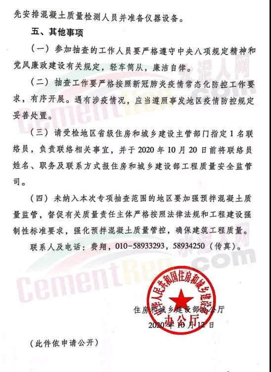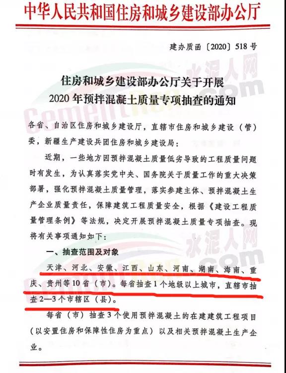 一、抽查范圍及對(duì)象:天津、河北、安徽、江西、山東、河南、湖南、海南、重慶、貴州等10省(市),每省抽查1個(gè)地級(jí)以上城市,直轄市抽查2~3個(gè)市轄區(qū)(縣)。每省(市)抽查3個(gè)使用預(yù)拌混凝土的在建建筑工程項(xiàng)目以及相關(guān)預(yù)拌混凝土生產(chǎn)企業(yè)。二、抽查內(nèi)容:受檢工程的建設(shè)、施工、監(jiān)理、預(yù)拌混凝土生產(chǎn)等單位及其從業(yè)人員執(zhí)行混凝土質(zhì)量相關(guān)法律法規(guī)和工程建設(shè)強(qiáng)制性標(biāo)準(zhǔn)情況;工程實(shí)體混凝土質(zhì)量情況等。三、抽查時(shí)間:抽時(shí)間從2020年11月開(kāi)始,具體時(shí)間另行通知。通知全文如下: