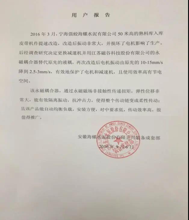據(jù)江蘇磁谷負(fù)責(zé)人介紹,其另一款節(jié)能新產(chǎn)品繞組永磁耦合調(diào)速器也已經(jīng)成功應(yīng)用于海螺水泥。
