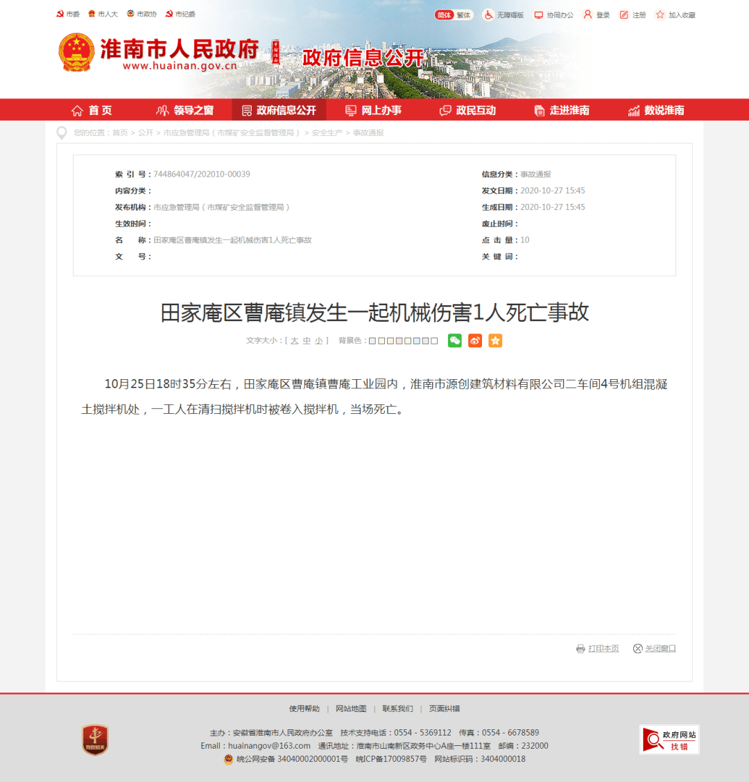 通報內(nèi)容提到,10月25日18時35分左右,田家庵區(qū)曹庵鎮(zhèn)曹庵工業(yè)園內(nèi),淮南市源創(chuàng)建筑材料有限公司二車間4號機(jī)組混凝土攪拌機(jī)處,一工人在清掃攪拌機(jī)時被卷入攪拌機(jī),當(dāng)場死亡。