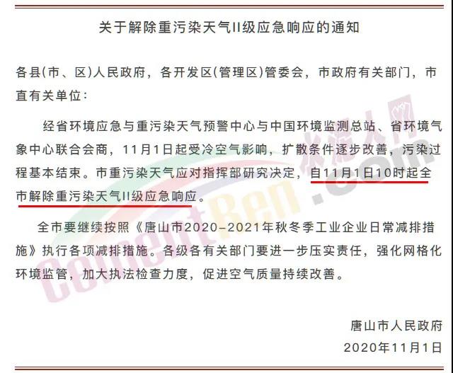 同日,河北唐山市政府也發(fā)布了《關(guān)于解除重污染天氣II級(jí)應(yīng)急響應(yīng)的通知》稱經(jīng)省環(huán)境應(yīng)急與重污染天氣預(yù)警中心與中國(guó)環(huán)境監(jiān)測(cè)總站、省環(huán)境氣象中心聯(lián)合會(huì)商,11月1日起受冷空氣影響,擴(kuò)散條件逐步改善,污染過程基本結(jié)束。市重污染天氣應(yīng)對(duì)指揮部研究決定,自11月1日10時(shí)起全市解除重污染天氣II級(jí)應(yīng)急響應(yīng)。