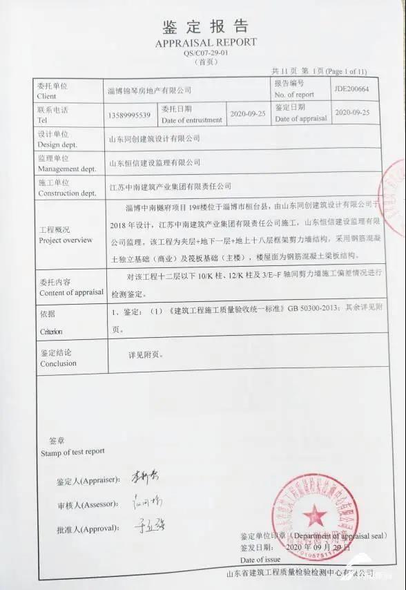 針對19號樓施工偏移問題,開發(fā)企業(yè)一名工作人員表示,項(xiàng)目公司淄博錦琴房地產(chǎn)有限公司已經(jīng)委托山東省建筑工程質(zhì)量檢驗(yàn)檢測中心有限公司對12層以下框架柱和剪力墻施工偏差情況進(jìn)行檢測鑒定。