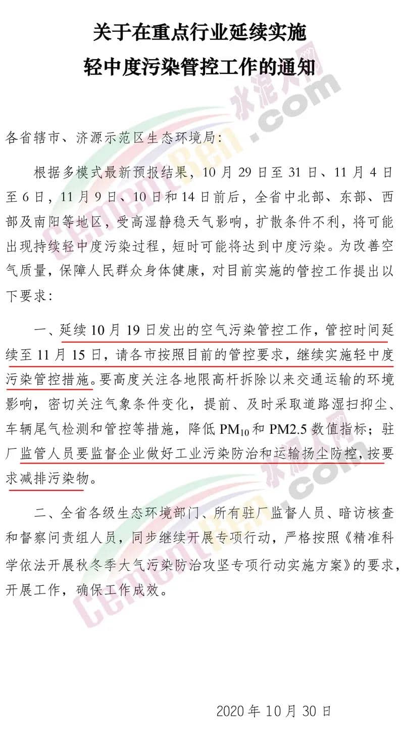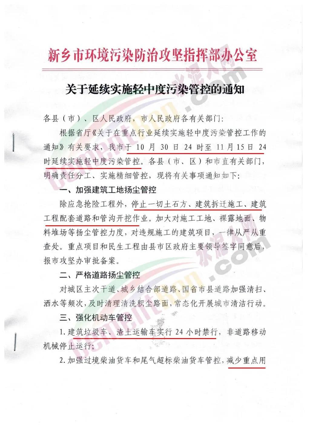 新鄉(xiāng)市環(huán)境污染防治攻堅指揮部辦公室發(fā)布《關(guān)于延續(xù)實施輕中度污染管控的通知》稱,根據(jù)省廳《關(guān)于在重點(diǎn)行業(yè)延續(xù)實施輕中度污染管控工作的 通知》有關(guān)要求,于10月30日24時至11月15日24時延續(xù)實施輕中度污染管控。