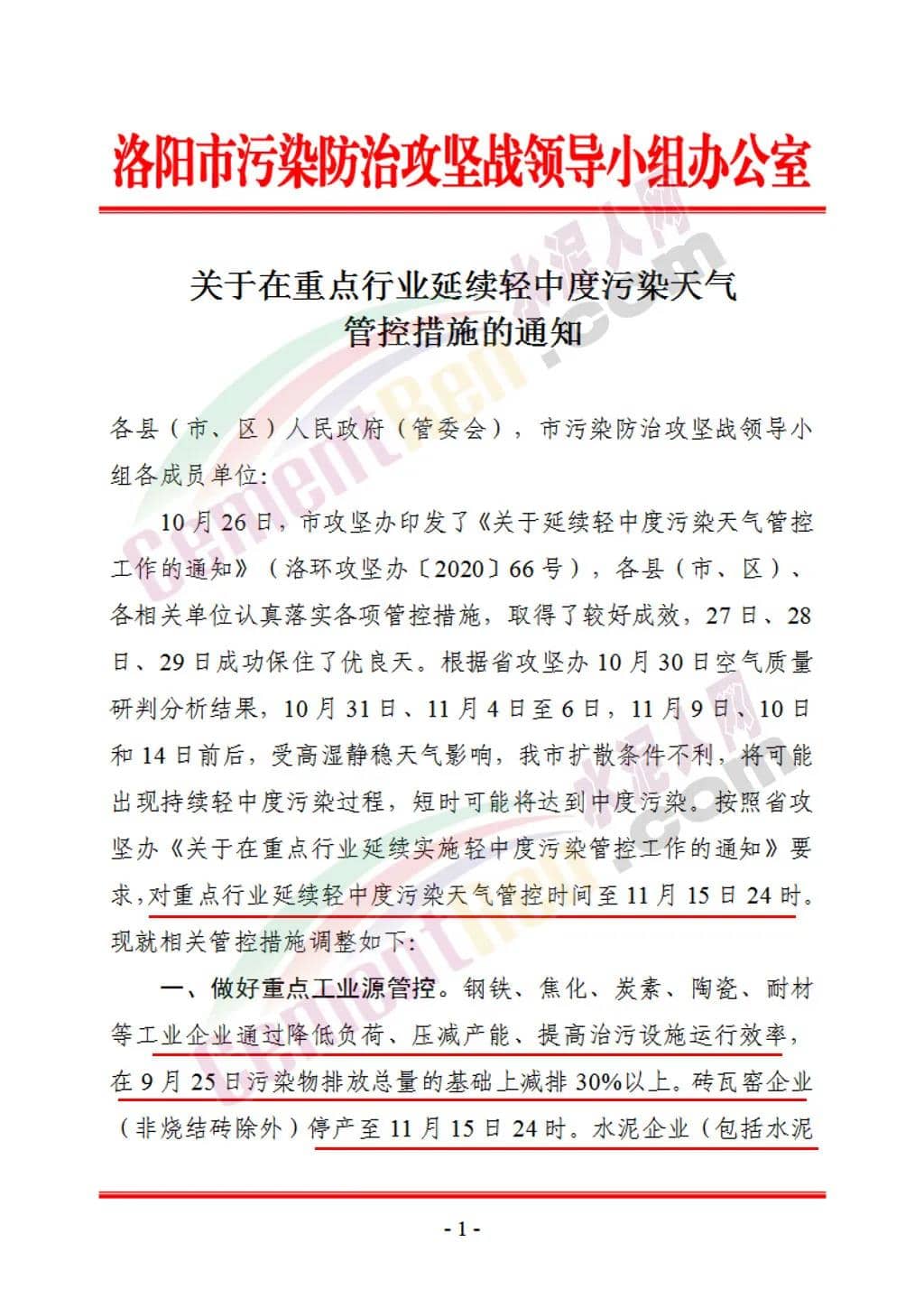 同期,河南省新鄉(xiāng)市、洛陽市等區(qū)域環(huán)保部門分別發(fā)布在重點(diǎn)行業(yè)延續(xù)輕中度污染天氣管控措施的通知。