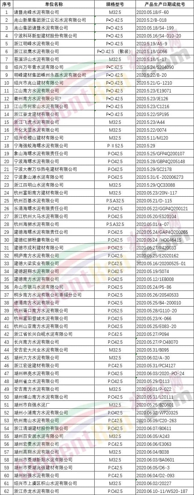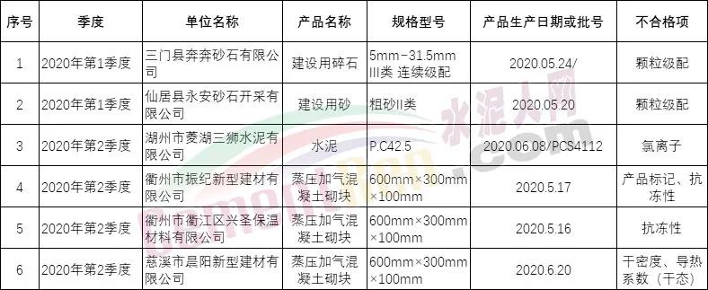 不合格企業(yè)為湖州市菱湖三獅水泥有限公司 P.C42.5 產(chǎn)品生產(chǎn)日期/批號為2020.06.08/PCS4112,不合格項(xiàng)目為氯離子。