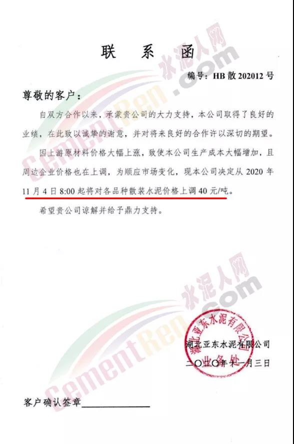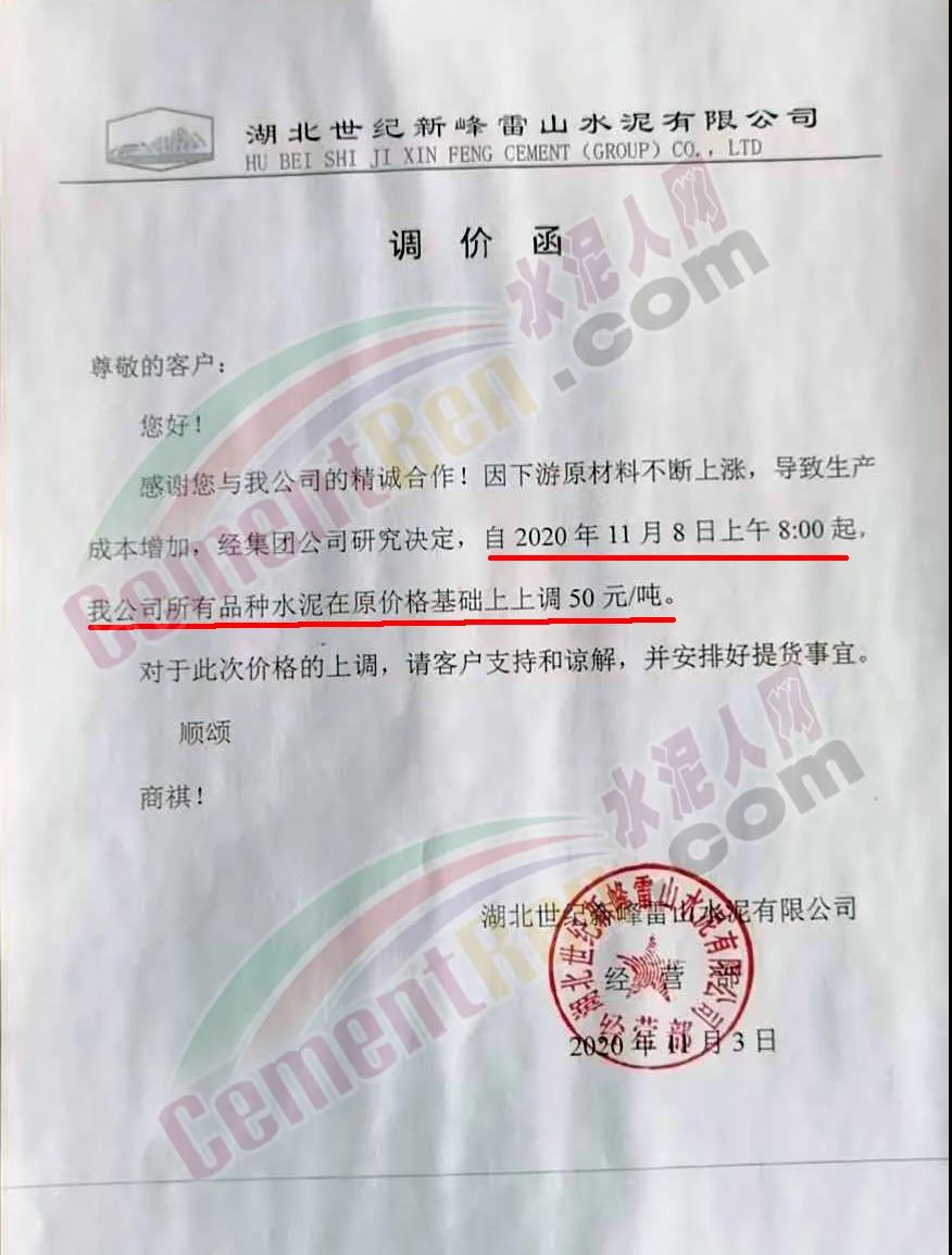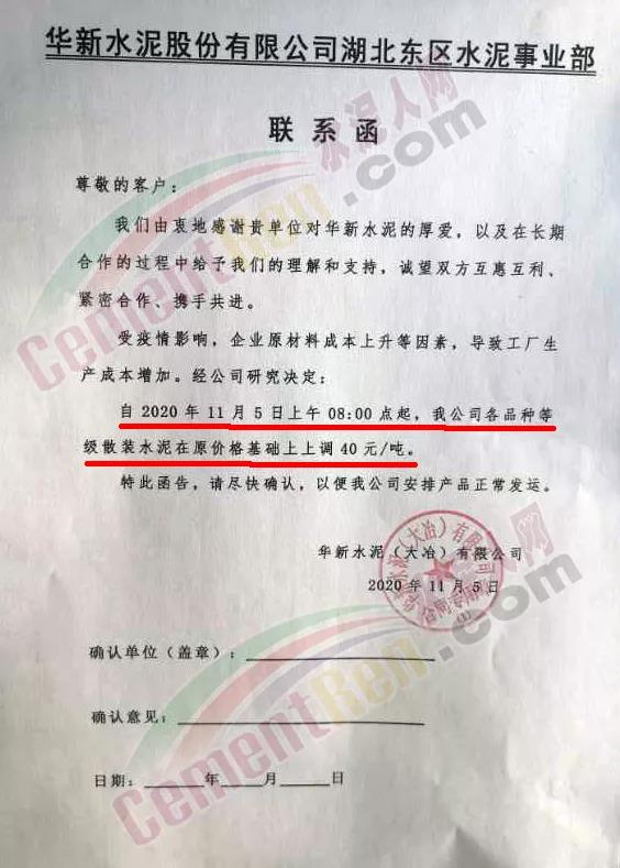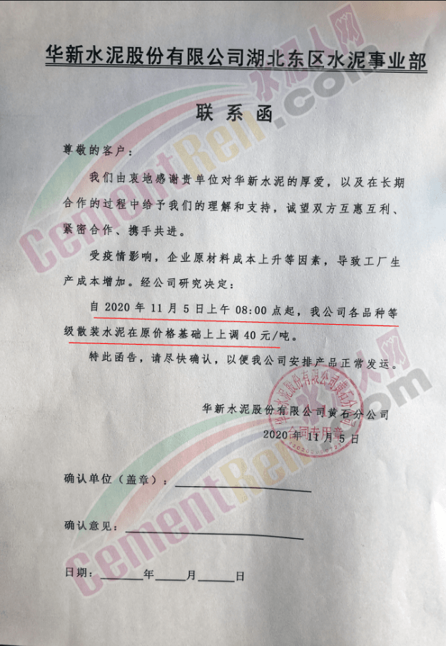 華新水泥湖北東區(qū)水泥事業(yè)部鄂州公司、黃石分公司、大冶公司聯(lián)系函稱,受疫情影響,企業(yè)原材料成本上升等因素,導致工作生產(chǎn)成本增加,經(jīng)公司研究決定 ,自11月5日上午8時起,公司各品種等級散裝水泥在原價基礎上上調(diào)40元/噸。