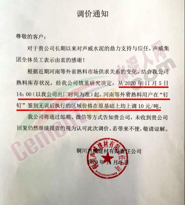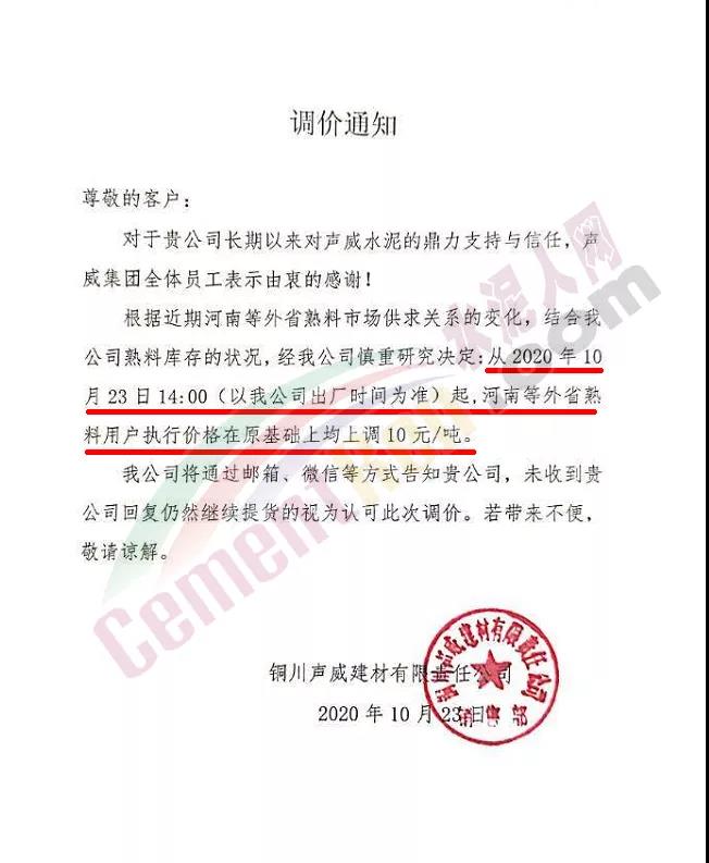 據(jù)水泥人網(wǎng)了解,10月23日陜西銅川聲威建材有限公司也曾發(fā)通知對河南等外省熟料用戶執(zhí)行價格在原基礎上上調(diào)10元/噸。