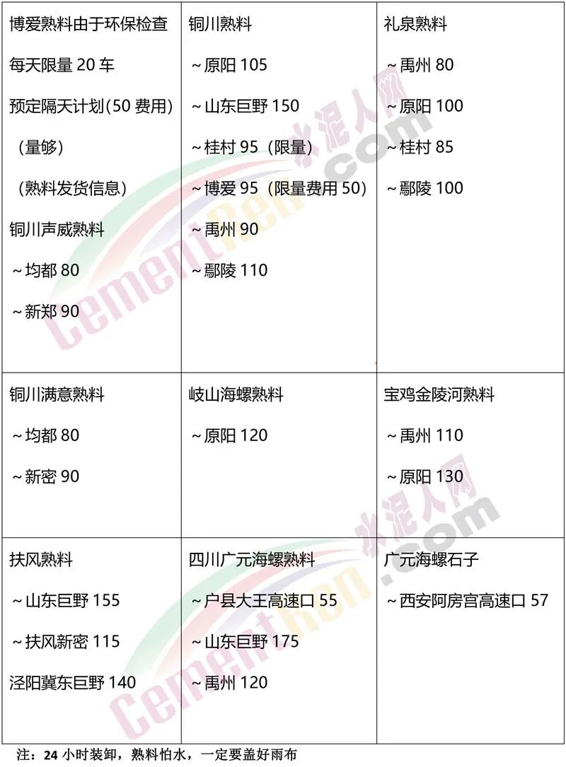 自去年四季度河南區(qū)域經(jīng)銷商將山西熟料“拉空”后,跨省到陜西采購以來,關中區(qū)域就一直有熟料供應河南區(qū)域。而且不僅銅川聲威建材,海螺、冀東、堯柏以及四川廣元區(qū)域均有熟料和水泥經(jīng)由貿(mào)易商轉(zhuǎn)售到河南多區(qū)域。從貿(mào)易商近期發(fā)布相關信息可見,熟料從陜西區(qū)域運至河南區(qū)域運費約在80~100元左右,到達山東荷澤區(qū)域運費在120~155元左右。且通知因環(huán)保管控每天限量20車,需提前以現(xiàn)金預定。