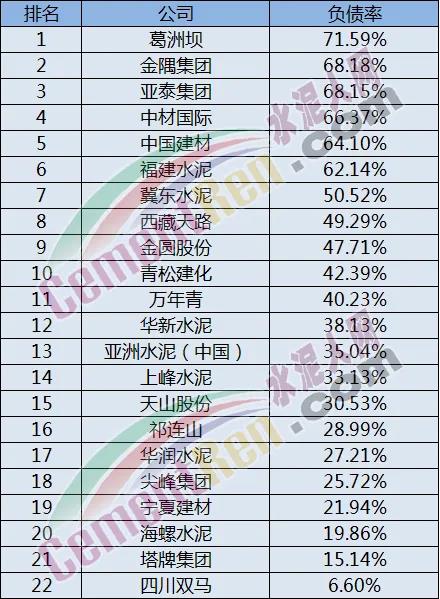 負債率往往也是觀測一個企業(yè)發(fā)展與活力的重要數(shù)據(jù),負債率太高或者太低,對于企業(yè)來說都不是一個好苗頭。排名整體看來大部分企業(yè)的負債率都在正常范圍內,除了第一名的葛洲壩,負債率達到了71.59%;第二名的金隅集團與第三名的亞泰集團負債率分別達到了68.18%和68.15%,第四名中材國際為66.37%,第五名中國建材為64.10%,海螺水泥處于倒數(shù)第三名,有19.86%的負債率,塔牌集團倒數(shù)第二為15.14%,四川雙馬是最后一名,負債率低至6.6%。