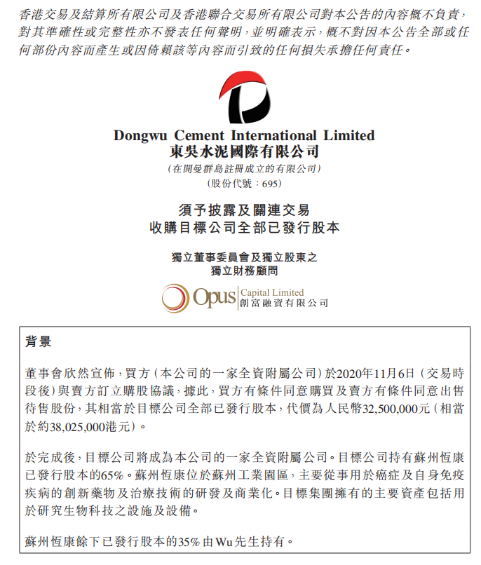 東吳水泥(00695)發(fā)布公告,于2020年11月6日,公司全資附屬公司熙華(上海)投資管理有限公司作為買方,擬人民幣3250萬元向賣方東方恒信資本控股集團有限公司購買目標公司(東方恒康生命科學有限公司)全部已發(fā)行股本。