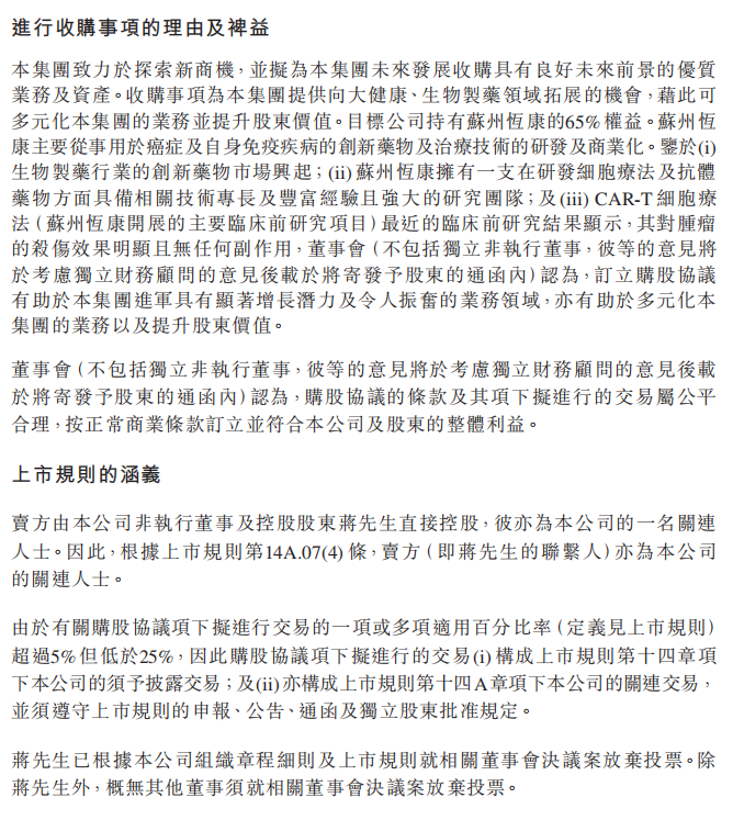 于完成后,目標公司將成為公司的一家全資附屬公司。目標公司持有蘇州恒康已發(fā)行股本的65%,蘇州恒康余下已發(fā)行股本的35%由Wu Jiong先生持有。蘇州恒康位于蘇州工業(yè)園區(qū),主要從事用于癌癥及自身免疫疾病的創(chuàng)新藥物及治療技術(shù)的研發(fā)及商業(yè)化。