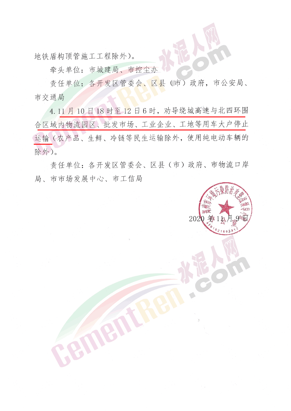 3. 繞城髙速與北四環(huán)圍合區(qū)域內(nèi)及滎陽市,11月9日20時至13日24時停止商砼罐車運輸;11月9日20時至12日12時,工地及混凝土攪拌站停止物料車運輸。4