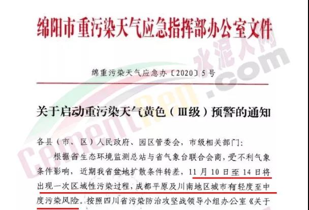 四川綿陽(yáng)發(fā)布《關(guān)于啟動(dòng)重污染天氣黃色(Ⅲ級(jí))預(yù)警的通知》要求十個(gè)區(qū)縣啟動(dòng)重污染天氣黃色(Ⅲ級(jí))預(yù)警。綿陽(yáng)市重污染天氣應(yīng)急指揮部將對(duì)各地各相關(guān)部門(mén)重污染天氣應(yīng)急預(yù)案措施落實(shí)情況開(kāi)展明查暗訪(fǎng)。對(duì)預(yù)案啟動(dòng)不及時(shí)、應(yīng)對(duì)工作不力、措施落實(shí)不到位的地區(qū)和單位進(jìn)行通報(bào),并納入生態(tài)環(huán)境黨政同責(zé)考核內(nèi)容。