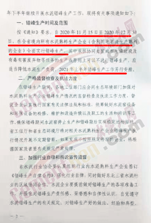 《通知》要求,自2020年11月15日至12月31日,在黑龍江省境內(nèi)所有水泥熟料生產(chǎn)企業(yè)(含利用電石渣生產(chǎn)熟料的企業(yè))全面實行錯峰生產(chǎn),其中承擔(dān)協(xié)同處置城市生活垃圾及有毒有害廢棄物等任務(wù)的生產(chǎn)線原則上可以不進行錯峰生產(chǎn),應(yīng)適當(dāng)降低水泥生產(chǎn)負(fù)荷。