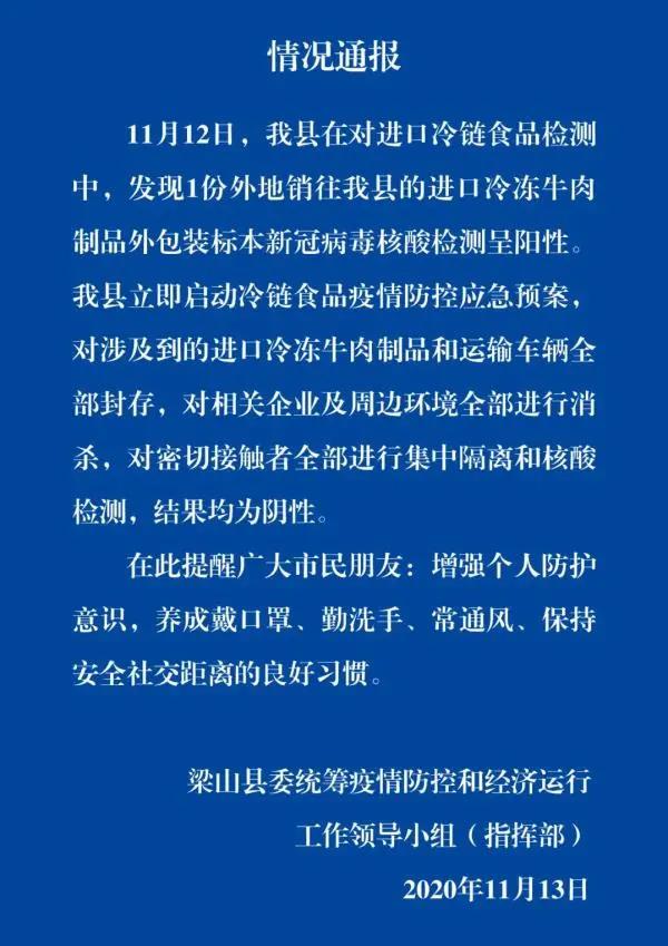 11月12日,山東濟(jì)寧梁山縣在對進(jìn)口冷鏈?zhǔn)称窓z測中,發(fā)現(xiàn)1份外地銷往梁山縣的進(jìn)口冷凍牛肉制品外包裝標(biāo)本新冠病毒核酸檢測呈陽性。