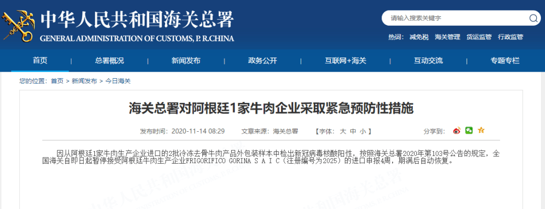 海關(guān)總署今天發(fā)布消息稱,因從阿根廷1家牛肉生產(chǎn)企業(yè)進(jìn)口的2批冷凍去骨牛肉產(chǎn)品外包裝樣本中檢出新冠病毒核酸陽性,按照海關(guān)總署2020年第103號公告的規(guī)定,全國海關(guān)自即日起暫停接受阿根廷牛肉生產(chǎn)企業(yè)FRIGORIFICO GORINA S A I C(注冊編號為2025)的進(jìn)口申報4周,期滿后自動恢復(fù)。