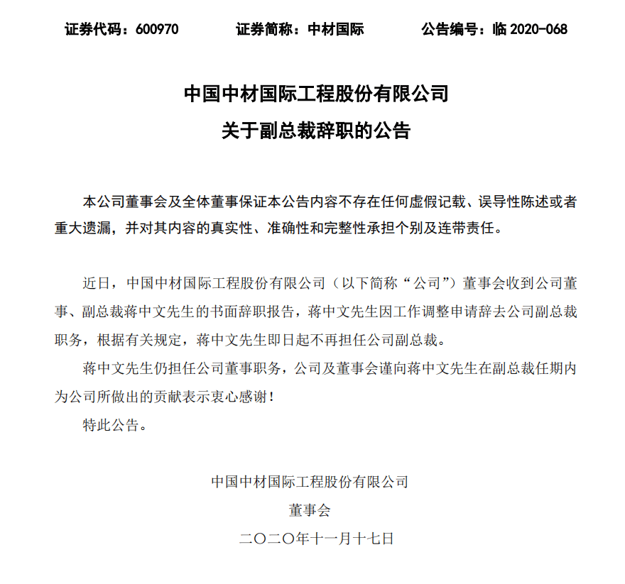 二、中國中材國際工程股份有限公司關(guān)于副總裁辭職的公告