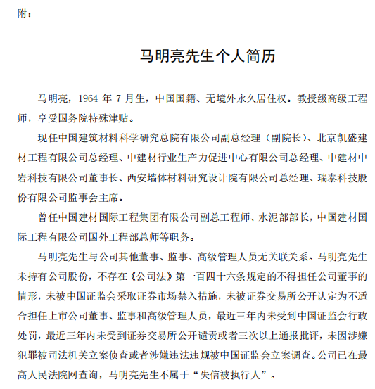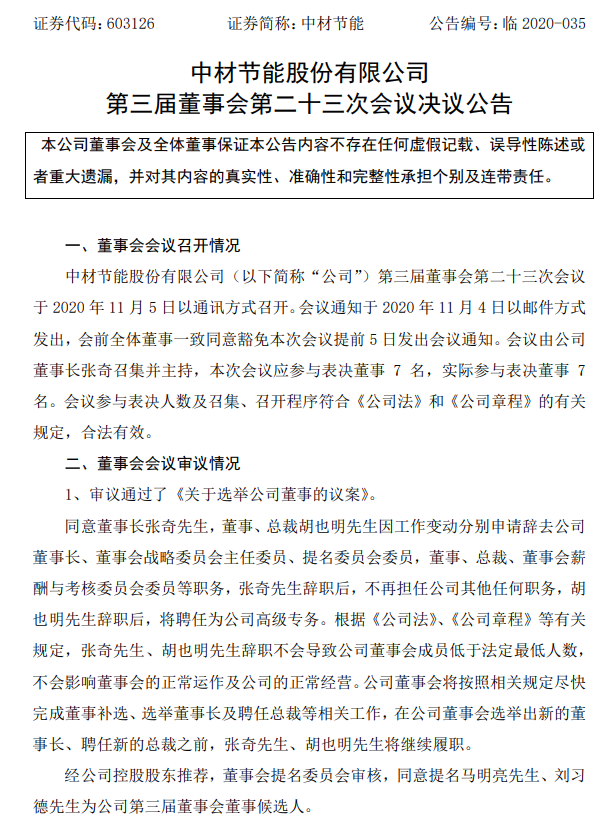1、胡也明離職總裁職位,離職時間為2020年11月17日,離職原因為:工作變動。2、付貴平上任副總經(jīng)理職位,上任時間為2020年11月17日。3、馬明亮上任總裁職位,上任時間為2020年11月17日。中材節(jié)能股份有限公司是中材集團旗下從事余熱、余壓利用的余熱發(fā)電全方位服務(wù)商。中材節(jié)能致力于工業(yè)余熱、余壓的技術(shù)開發(fā)、綜合利用和產(chǎn)業(yè)化,擁有該領(lǐng)域及相關(guān)領(lǐng)域的設(shè)計、對外貿(mào)易經(jīng)營以及對外工程總承包等各類經(jīng)營資質(zhì),主要從事余熱發(fā)電項目的投資、技術(shù)開發(fā)、系統(tǒng)集成、工程設(shè)計、咨詢及工程總承包,提供清潔發(fā)展機制項目的開發(fā)方案及技術(shù)咨詢.中材節(jié)能也是經(jīng)國家商務(wù)部批準的承包境外低溫余熱發(fā)電系統(tǒng)工程和境內(nèi)國際招標(biāo)工程等業(yè)務(wù)的公司。