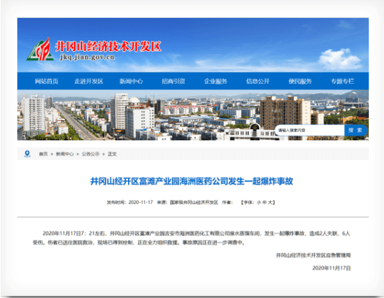 17日7時21分左右,江西吉安市海州醫(yī)藥化工有限公司廢水蒸餾車間發(fā)生爆炸。目擊者稱,地面上滿是被炸飛的磚頭。事發(fā)后,井岡山經(jīng)濟(jì)技術(shù)開發(fā)區(qū)應(yīng)急管理局通報稱,事故致2人失聯(lián)、6人受傷。傷者已送往醫(yī)院救治,現(xiàn)場已得到控制,正在全力組織救援。 18日,江西省應(yīng)急管理廳發(fā)布消息稱,爆炸中2名失聯(lián)者確認(rèn)遇難,遺體分別于17日10時34分和15時找到,至此事故共造成2人死亡、1人重傷、5人輕傷。具體事故原因還在進(jìn)一步調(diào)查中。
