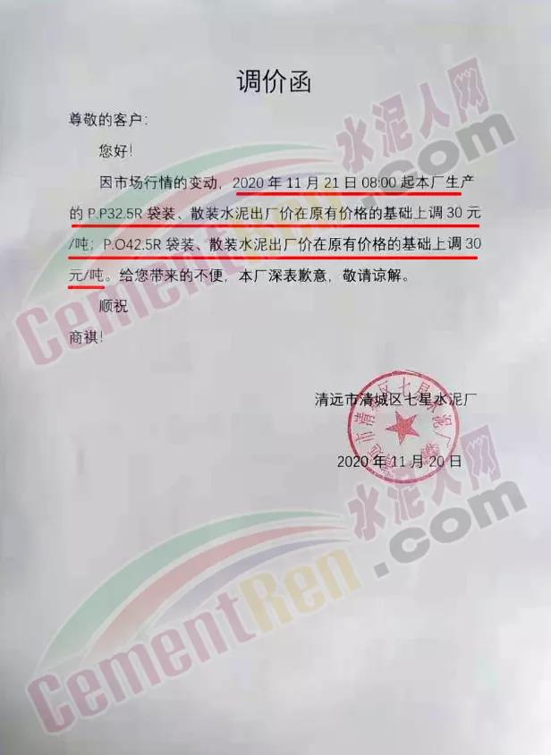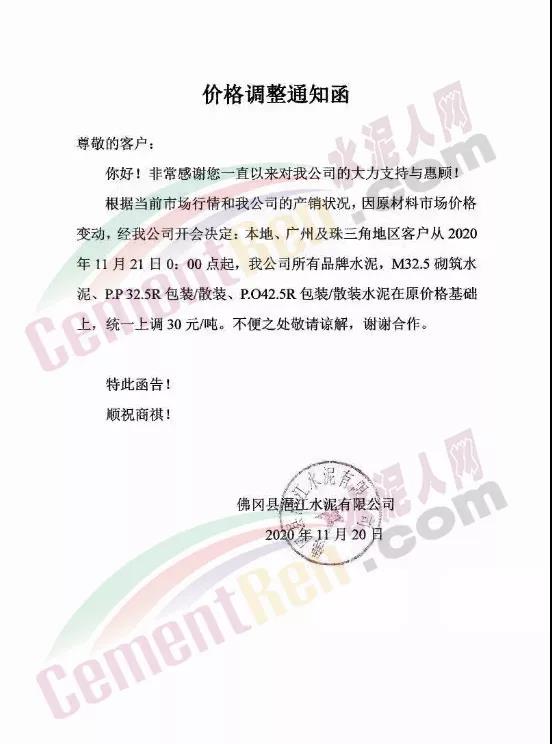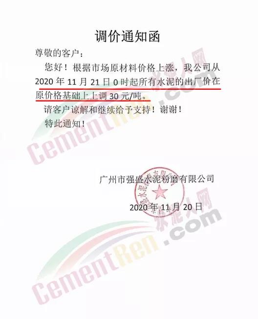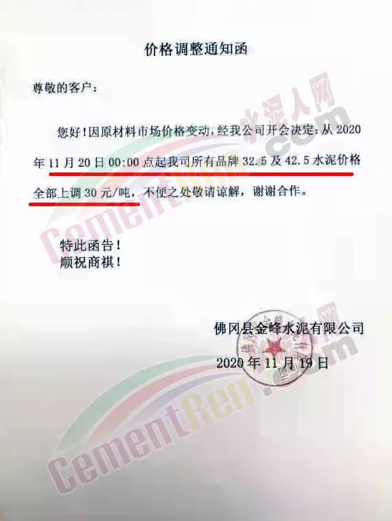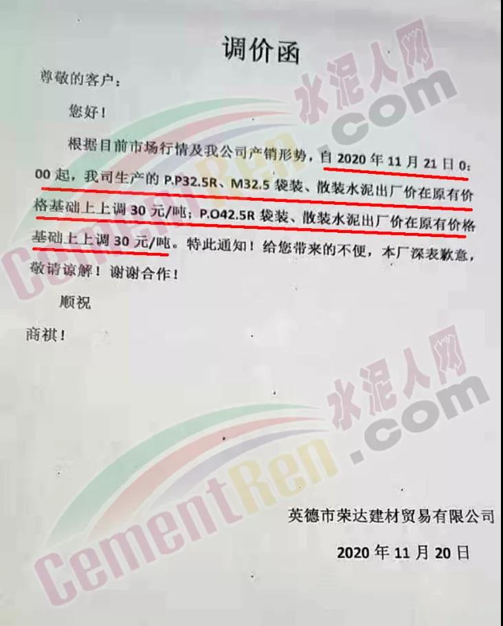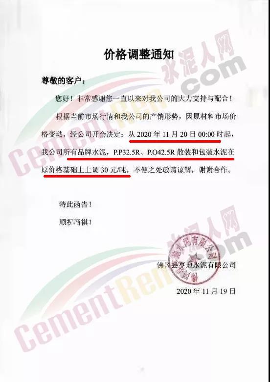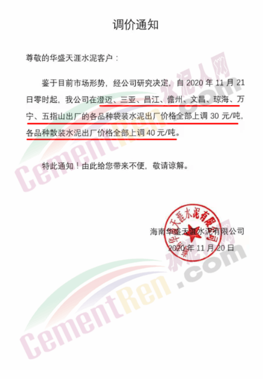 海南華盛天涯水泥有限公司調(diào)價通知稱,自2020年11月21日零時起,公司在澄邁、三亞、昌江、儋州、文昌、瓊海、萬寧、五指山出廠的各品種袋裝水泥出廠價格全部上調(diào)30元/噸,各品種散裝水泥出廠價格全部上調(diào)40元/噸。