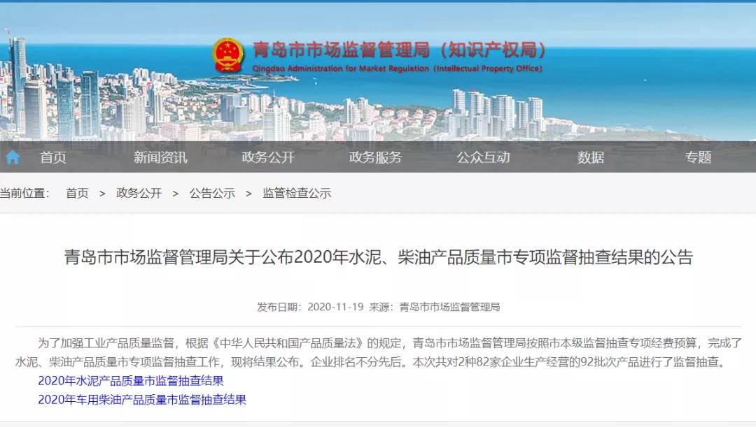 近日青島市市場監(jiān)管局發(fā)布2020年水泥、柴油產品抽檢報告,結果顯示,柴油產品合格率為100%,水泥合格率為96.7%。