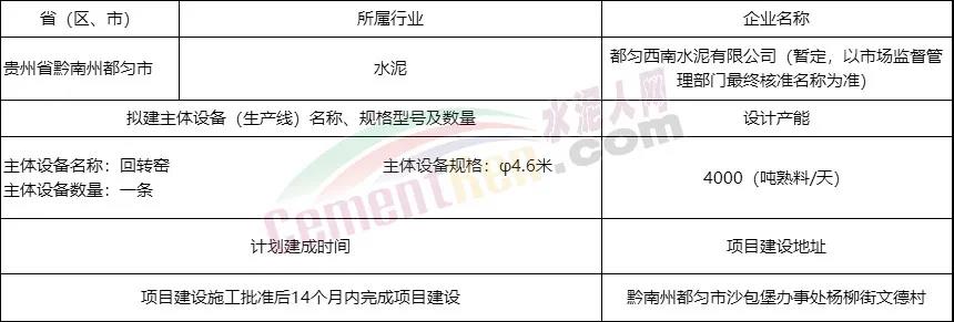 新建項(xiàng)目主體設(shè)備回轉(zhuǎn)窯直徑φ4.6米,設(shè)計(jì)產(chǎn)能4000t/d,建設(shè)地址位于黔南州都勻市沙包堡辦事處楊柳街文德村,將于項(xiàng)目建設(shè)施工批準(zhǔn)后14個(gè)月內(nèi)完成項(xiàng)目建設(shè)。詳情如下: