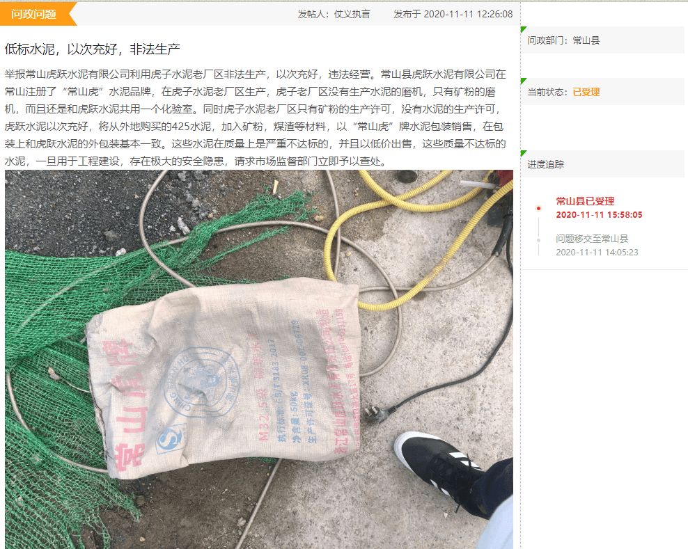 其實,被仿冒的又何止海螺水泥一家。日前,有網(wǎng)友在通衢網(wǎng)絡問政平臺留言舉報常山虎躍水泥有限公司利用虎子水泥老廠區(qū)非法生產(chǎn),以次充好,違法經(jīng)營。