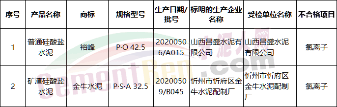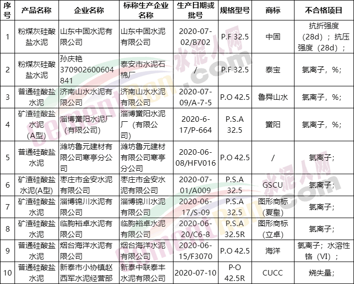 11月6日山東省市場監(jiān)督管理局網(wǎng)站公布2020年水泥產(chǎn)品質量省級監(jiān)督抽查結果, 發(fā)現(xiàn)10家企業(yè)的10批次產(chǎn)品不符合相關標準的要求,不合格項目為氯離子、燒失量、28d強度、水泥溶性鉻(VI)項目。