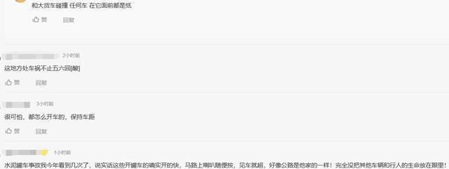 “很可怕,都怎么開車的,保持車距。”“水泥罐車事故我今年看到幾次了,說實(shí)話這些開罐車的確實(shí)開得快,馬路上喇叭隨便按,見車就超,好像公路是他家的一樣!完全沒把其他車輛和行人的生命放在眼里!”“和大貨車碰撞任何車在它面前都是紙。”
