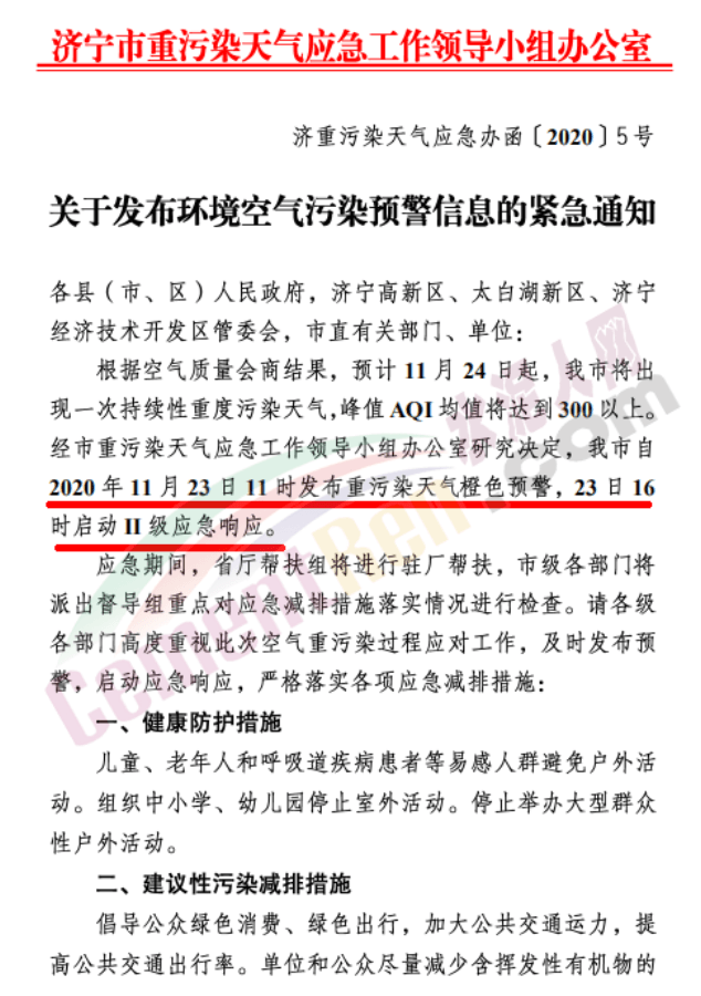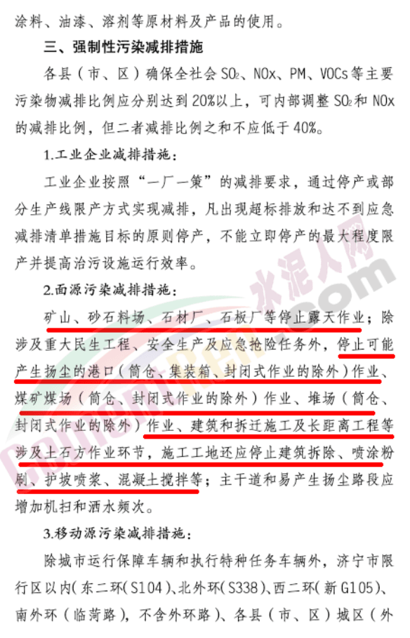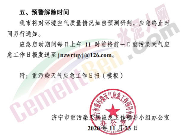 11月23日, 濟(jì)寧市重污染天氣應(yīng)急工作領(lǐng)導(dǎo)小組辦公室發(fā)布《關(guān)于發(fā)布環(huán)境空氣污染預(yù)警信息的緊急通知》要求自2020年11月23日11時(shí)發(fā)布重污染天氣橙色預(yù)警,23日16 時(shí)啟動(dòng)II 級(jí)應(yīng)急響應(yīng)。工業(yè)企業(yè)按照"一廠一策"的減排要求,通過(guò)停產(chǎn)或部分生產(chǎn)線限產(chǎn)方式實(shí)現(xiàn)減排,凡出現(xiàn)超標(biāo)排放和達(dá)不到應(yīng)急減排清單措施目標(biāo)的原則停產(chǎn),不能立即停產(chǎn)的最大程度限產(chǎn)并提高治污設(shè)施運(yùn)行效率。同樣未提及濟(jì)寧市生態(tài)環(huán)境局評(píng)為A類企業(yè)的濟(jì)寧海螺水泥如何減排。