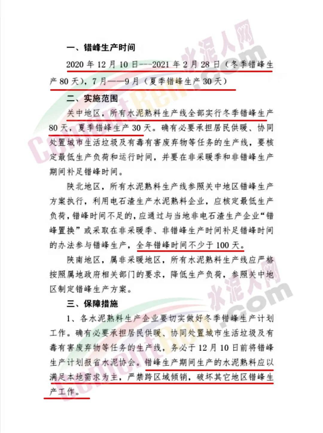 一、錯峰生產(chǎn)時間2020年12月10日—--2021年2月28日(冬季錯峰生產(chǎn)80天),7月——9月(夏季錯峰生產(chǎn)30天)二、實施范圍關(guān)中地區(qū),所有水泥熟料生產(chǎn)線全部實行冬季錯峰生產(chǎn)80天,夏季錯峰生產(chǎn)30天。確有必要承擔(dān)居民供暖、協(xié)同處置城市生活垃圾及有毒有害廢棄物等任務(wù)的生產(chǎn)線,要核定最低生產(chǎn)負(fù)荷和運(yùn)行時間,并要在非采暖季和非錯峰生產(chǎn)期間補(bǔ)足錯峰時間。陜北地區(qū),所有水泥熟料生產(chǎn)線參照關(guān)中地區(qū)錯峰生產(chǎn)方案執(zhí)行,利用電石渣生產(chǎn)水泥熟料企業(yè),應(yīng)核定最低生產(chǎn)負(fù)荷,錯峰時間不足的,應(yīng)通過與當(dāng)?shù)胤请娛a(chǎn)企業(yè)"錯峰置換"或采取在非采暖季、非錯峰生產(chǎn)時間補(bǔ)足錯峰時間的辦法參與錯峰生產(chǎn),全年錯峰時間不少于100天。陜南地區(qū),屬非采暖地區(qū),所有水泥熟料生產(chǎn)線應(yīng)嚴(yán)格按照屬地政府相關(guān)部門的要求,降低生產(chǎn)負(fù)荷,參照關(guān)中地區(qū)制定錯峰生產(chǎn)方案。三、保障措施1、各水泥熟料生產(chǎn)企業(yè)要切實做好冬季錯峰生產(chǎn)計劃工作。確有必要承擔(dān)居民供暖、協(xié)同處置城市生活垃圾及有毒有害廢棄物等任務(wù)的生產(chǎn)線,務(wù)必于12月10日前將錯峰生產(chǎn)計劃報省水泥協(xié)會。錯峰生產(chǎn)期間生產(chǎn)的水泥熟料應(yīng)以滿足本地需求為主,嚴(yán)禁跨區(qū)域傾銷,破壞其它地區(qū)錯峰生產(chǎn)工作。2、錯峰生產(chǎn)期間,若遇到嚴(yán)重污染天氣時,水泥熟料生產(chǎn)企業(yè)應(yīng)按照屬地政府相關(guān)部門的要求,嚴(yán)格落實各項減排措施,減少污染物排放,做好停產(chǎn)應(yīng)急響應(yīng)工作,其原生產(chǎn)計劃不再變更。鼓勵全省所有水泥企業(yè)結(jié)合當(dāng)?shù)貙嶋H情況,在春節(jié)、酷暑伏天、雨季和重大活動期間主動開展錯峰生產(chǎn)。3、省水泥協(xié)會將匯總省內(nèi)各水泥企業(yè)錯峰生產(chǎn)計劃,分別報省、市(區(qū))工信和生態(tài)環(huán)境部門備案,并牽頭組織自律成員單位檢查錯峰生產(chǎn)計劃執(zhí)行情況,對不參與或開展錯峰生產(chǎn)不力的企業(yè),將予以通報。省水泥協(xié)會按進(jìn)度對錯峰生產(chǎn)工作進(jìn)行總結(jié),并將執(zhí)行情況向行業(yè)主管部門報告。通知原文如下: