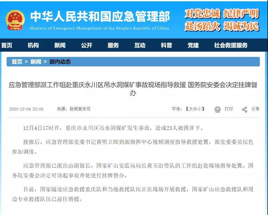接報后,應(yīng)急管理部黨委書記黃明立即到部指揮中心視頻調(diào)度指導(dǎo)救援處置。部黨委委員瓊色參加調(diào)度。應(yīng)急管理部已派出由副部長、國家礦山安監(jiān)局局長黃玉治帶隊的工作組趕赴現(xiàn)場指導(dǎo)處置。國務(wù)院安委會決定對該起事故查處進行掛牌督辦。目前,國家隧道應(yīng)急救援重慶隊和當(dāng)?shù)鼐仍犖檎诂F(xiàn)場開展救援,國家礦山應(yīng)急救援隊和周邊專業(yè)救援隊伍已前往增援。