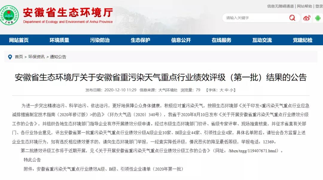 日前,安徽省生態(tài)環(huán)境廳發(fā)布《關(guān)于安徽省重污染天氣重點行業(yè)績效評級(第一批)結(jié)果的公告》稱,經(jīng)過市級生態(tài)環(huán)境部門初評、省級專家評審、現(xiàn)場抽查核查,并征求省直有關(guān)部門、各行業(yè)協(xié)會意見,評出安徽省第一批重污染天氣重點行業(yè)績效分級A級企業(yè)10家、B級企業(yè)44家、引領(lǐng)性企業(yè)4家。