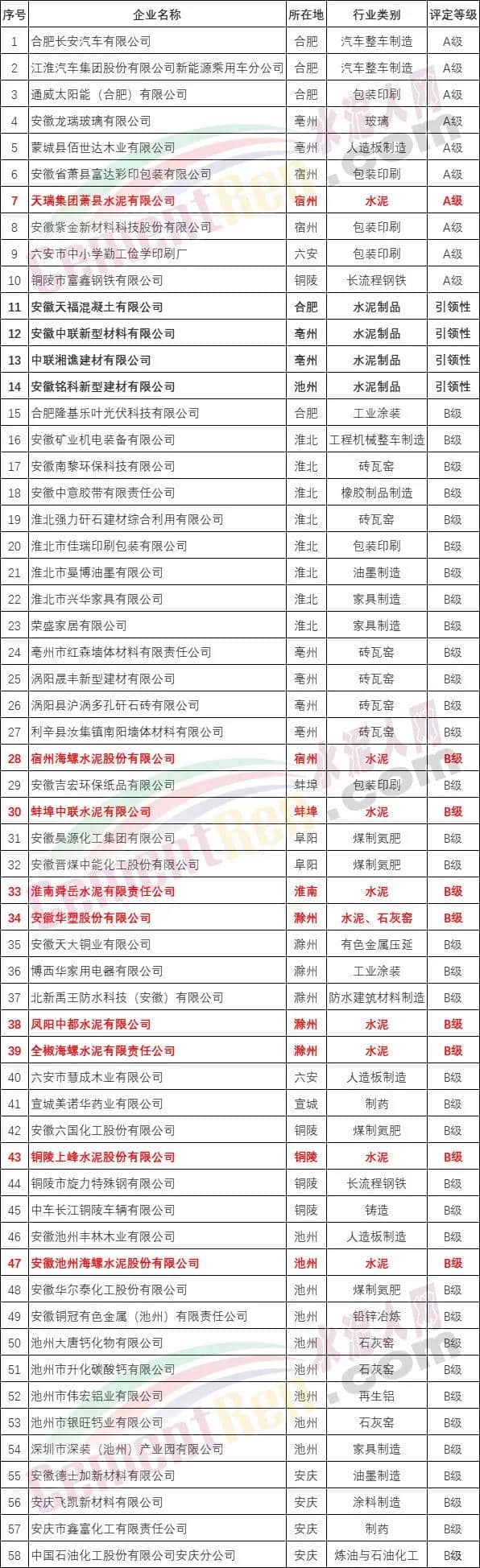 B級企業(yè)包括8家水泥企業(yè)分別為:① 宿州海螺水泥股份有限公司;② 蚌埠中聯(lián)水泥有限公司 ;③ 淮南舜岳水泥有限責(zé)任公司;④ 鳳陽中都水泥有限公司;⑤ 全椒海螺水泥有限責(zé)任公司 ;⑥ 銅陵上峰水泥股份有限公司;⑦ 安徽池州海螺水泥股份有限公司 ; ⑧安徽華塑股份有限公司。公告原文如下: