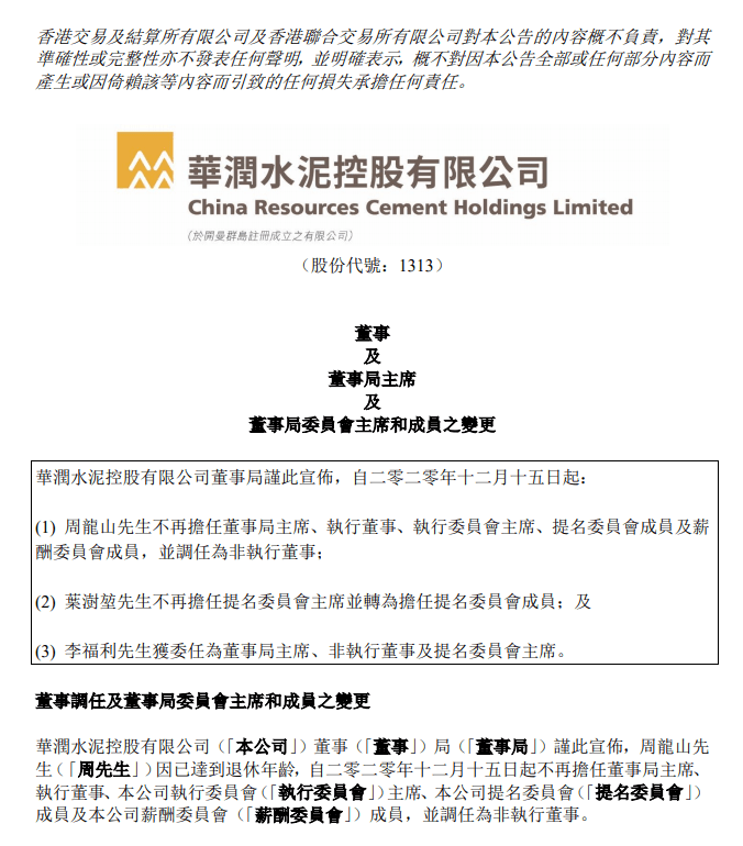 華潤水泥控股(01313)公布,周龍山不再擔任董事局主席、執(zhí)行董事、執(zhí)行委員會主席、提名委員會成員及薪酬委員會成員,并調任為非執(zhí)行董事;