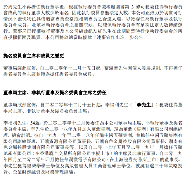 葉澍堃不再擔任提名委員會主席并轉為擔任提名委員會成員;同時,李福利獲委任為董事局主席、非執(zhí)行董事及提名委員會主席。以上人事變動均自2020年12月15日起。